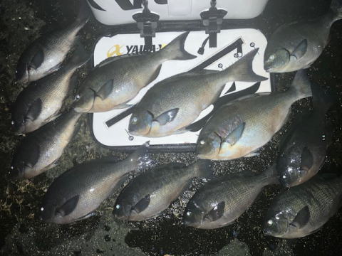 | 1年ぶりに梅浦の沖磯へ 満員御礼の為 とりあえず手前の沖磯で数匹グレを釣ってから 朝からやっているカゴ釣り師と入れかわりで 11時ごろから再スタート 青物回遊中の為 あまりエサトリも居なく竿2本の深タナで キーパー口太がポツポツ釣れ期待の夕マズメ 去年の再来どおり4投で4匹尾長ゲットで! サイズも41センチ2匹で! 次回も尾長チャレンジしたいが天候次第です。 |